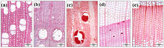 Cross-sections of five species of wood. (a) Populus ussuriensis; (b) Fraxinus chinensis; (c) Swietenia macrophylla; (d) Cunninghamia konishii; (e) Larix gmelinii. Scale bars: (a–e) = 100 μm.