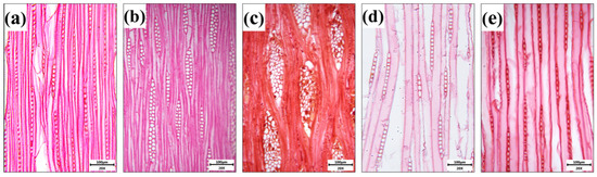 Tangential sections of five species of wood. (a) Populus ussuriensis; (b) Fraxinus chinensis; (c) Swietenia macrophylla; (d) Cunninghamia konishii; (e) Larix gmelinii. Scale bars: (a–e) = 100 μm.