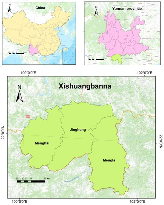 Landsat data were downloaded from the United States Geological Survey website http://www.usgs.gov/ (accessed on 1 November 2023), pre-processed with radiation and atmospheric correction, and then cropped using the Xishuangbanna Administrative Vector Map to obtain a Xishuangbanna image.