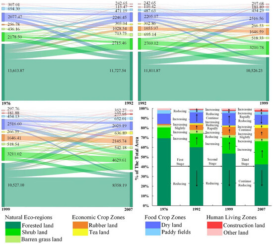 In general, during the entire study period of 1976–2007, the area of natural eco-regions in Xishuangbanna decreased, the areas of economic crop and human living zones increased, and the area of food crop zones decreased slightly (Figure 2). The region was mainly characterized by decreases in forested, dry, and other land, and by increases in shrub, rubber, barren, construction, and tea land; appreciable differences were observed in the changes in each land type.