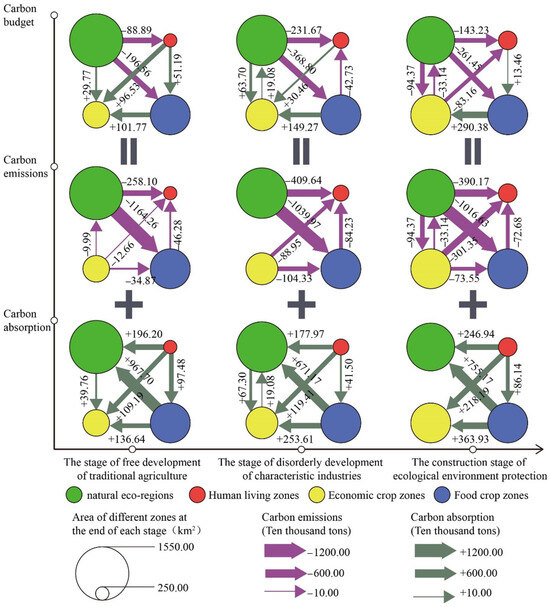 The land-use changes among the four zones we identified can be expected to have an impact on carbon adsorption and emission in the Xishuangbanna region. Therefore, we systematically analyzed the carbon budget under different land-use change paths (Figure 3).