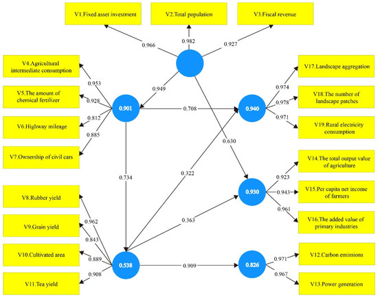 A REDD+ benefit evaluation system was established for the Xishuangbanna region, with socio-economic shifts as the driver (D), production factor inputs as the main pressure (P), land-use change as the main state (S), and REDD+ carbon benefits (I1), social benefits (I2), and environment-based benefits (I3) as the impacts in a DPSI model. The model was assembled using 19 specific observed variables (Table 1). All indexes passed the significance test and reflected the basic characteristics of latent variables. Based on the requirements of the reliability and validity tests (Cronbach’s α value > 0.6; CR > 0.7; AVE > 0.5), the relevant indexes met all standards (Table 2) and could explain approximately 90% of the total number of variances; therefore, the overall measurement model was determined to be credible and valid.
