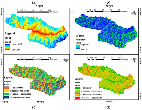 (a) Digital elevation model value, (b) hill shade value, (c) aspect value, and (d) slope value.