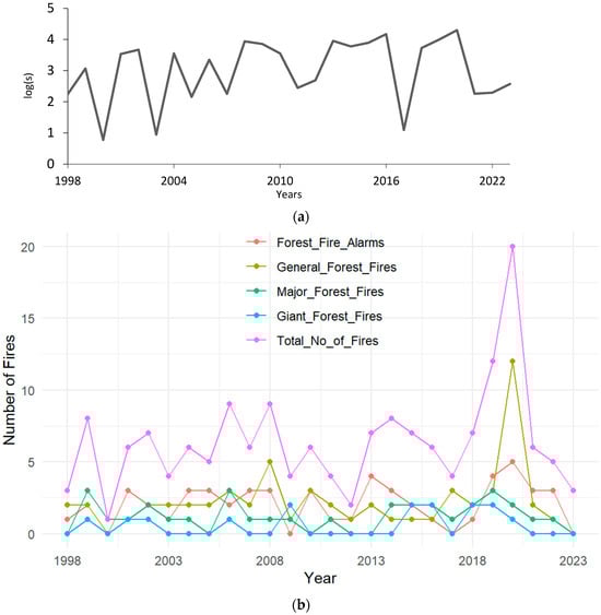Between 1998 and 2023, 169 fires were reported in the Diamer District. The total burned area amounted to approximately 109,401.325 hectares, with an average of 4207.74 hectares per year. Given the significant variation in the size of each forest fire, their log numbers are calculated to represent the extent of each fire’s impact on the forested area (see Figure 3a). It is noted that the smallest number was 6 hectares in 2000, whereas the largest was an impressive 1.9 × 104 hectares in 2020 (see Figure 3b). Notably, 2017, 2018, 2019, and 2020 logged substantially higher burned areas than earlier years, which is a clear indicator of enhanced fire severity. This is in line with the global trends where fire frequency and intensity have been shown to increase gradually in many locations, along with climate change. The outcome is that the fire cycles in Diamer District are taking three to four years, which is the most important window for targeted management interventions. From 1998 to 2023, 169 forest fires occurred primarily in May, June, and July, accounting for 5.2 × 104 ha, 2.82 × 104 ha, and 2.14 × 104 ha, respectively. This seasonal clustering elevates the strong impact of climatic conditions, primarily temperature and humidity, during peak fire months. These results strongly emphasize the necessity of resource and preventive deployments for this high-risk period in the Diamer District.