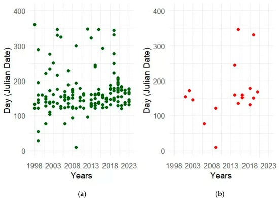(a) Diamer District, Julian dates of fires from 1998 to 2023; (b) Diamer District, Julian dates of huge fires from 1998 to 2023.