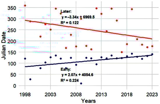 Julian dates of the earliest and latest forest fires in the Diamer District from 1998 to 2023. blue bullets and line signifies early fire events and its regression, red bullets and line shows later fire events and its regression.