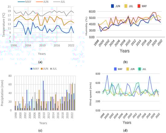 Diamer District, annual climate conditions in May, June, and July from 1998 to 2023. (a) temperature; (b) relative humidity; (c) annual rainfall; (d) wind speed.