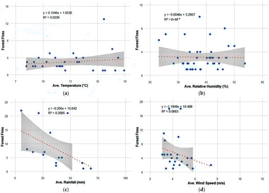 We conducted an investigation into the correlation between forest fires and climate factors during May, June, and July from 1998 to 2023 because of the high concentration of forest fires during these three months. Our analysis reveals that the regression models and associated indices are as follows (Figure 7). The findings indicate a significant correlation (p < 0.05) between the occurrence of fires and those four different types of climate data obtained in the Diamer District.
