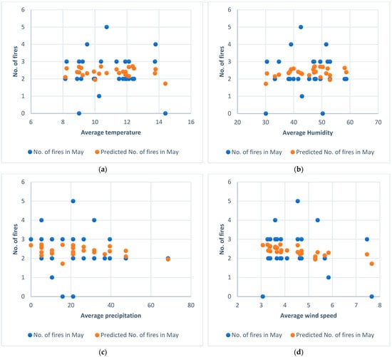 The scatter plots (Figure 8) show the correlation between the number of forest fires in May and four environmental conditions: average temperature, average humidity, average precipitation, and average wind speed over the years. The plots for average temperature and average humidity show slightly more variation in the number of fires than average precipitation and wind speed. Moreover, the predicted values from the regression model closely follow the actual data. These visualizations suggest that average temperature, humidity, precipitation, and wind speed are not very strong predictors of forest fires and affect forest fires in a minimal sense. These results support the applicability of meteorological indicators for use in early warning systems to make more accurate fire risk predictions during critical months.