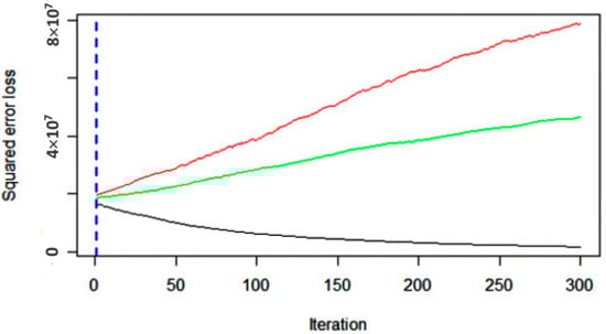 Squared error loss across iterations for random forest and GBM models. The black curve is training set loss and the green and red curves represent validation loss for the Random Forest and Gradient Boosting Machine models, respectively. The blue dashed line represents the optimal point of iteration for the Gradient Boosting Machine model. The figure represents the model’s learning dynamics: Random Forest depicts a relatively low overall error with more stable convergence compared to Gradient Boosting Machine, showing a growing error from overfitting at the later iterations.