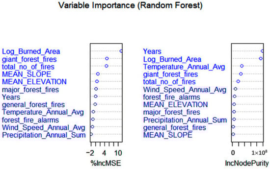 RMSE and R-squared (R2) analyses were incorporated to evaluate the achieved performance for the RF and GBM models. The performance of the RF model was observed to be an RMSE of 5803.69, which explains only 49.47% of the variance of the burned area data. Conversely, the GBM model produced a lower RMSE of 7176.67, showing an explanation of 46.9% variance after parameter tuning and cross-validation, which was less than that of the RF model (Figure 9). Such two models were fairly accurate, though the RF model was able to perform better in capturing complex interaction among climatic and topographical variables, thus preferred for this study.