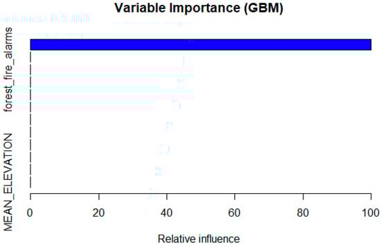 Variable importance in the Gradient Boosting Model (GBM). The x-axis is the relative influence of each variable on a scale from 0 to 100%. The higher the value, the more significantly the variable contributes to the model’s predictions. In this figure, ‘forest_fire_alarms’ is the most important variable, contributing almost entirely to the prediction, while ‘MEAN_ELEVATION’ shows negligible influence.