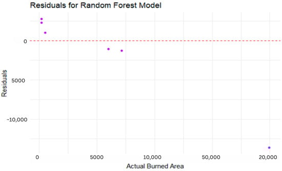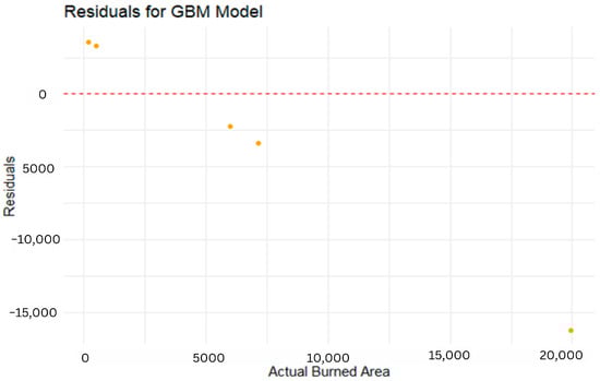 The anticipated accuracy of each model was verified through the creation of residual plots. As shown in Figure 12, the model’s residual plot of the RF model showed very small residuals for all values of the burned area, suggesting the model can predict even low and high fire events. On the other hand, the residual plots for the GBM model, as shown in Figure 13, had larger residual deviations mainly for higher values of burned area, which indicates the model is less effective and sensitive to extreme events. This further enhances the credibility of the RF model to use in the actual application involving fire risk prediction, mainly where unstable fire intensities prevail in regions.