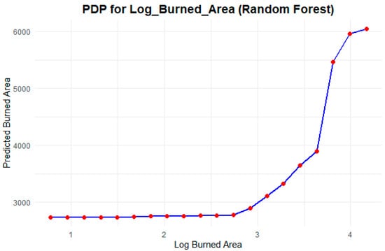 Partial Dependence Plot (PDP) for the Log of Burned Area in the Random Forest Model, showing the log-transformed burned area (in hectares) on the x-axis, while indicating the predicted burned area on the y-axis. The plot suggests that for low log burned area values (below 3), the predicted area remains stable at around 3000 hectares. However, predictions increase sharply when the log burned area exceeds, highlighting that the model predicts significantly higher burned areas for larger fires, suggesting the model’s sensitivity to extreme fire events.