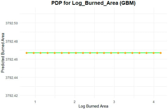 The x-axis indicates the log-transformed burned area (in hectares), while the y-axis represents the predicted burned area. The horizontal line signifies that variations in the log-transformed burned area do not notably influence the model’s predictions, indicating that the GBM model does not substantially account for this variable in forecasting burned areas. This implies a limitation in the model’s effectiveness for accurately predicting the extent of burned areas.