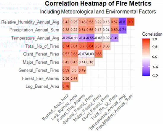 The correlation between burned area and meteorological factors is illustrated in Figure 16. Burned area is negatively correlated with precipitation (−0.38) and relative humidity (−0.42), meaning that higher moisture levels lower fire activity. A positive correlation with temperature (0.26) indicates that higher temperatures favor fire spread. These correlations are within the moderate range (±0.4 to ±0.5) but are ecologically meaningful because of the complexity of interactions influencing fire dynamics. Relative humidity sheds light on the atmospheric moisture role. The very low correlations between giant forest fires and meteorological factors might be indicative of some anthropogenic influence, including human-induced ignitions or land-use changes.