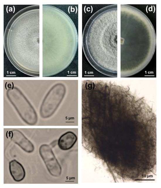 Morphological characteristics, colony morphology, and microscopic examination of fungi isolated from lucky bamboo. (a–d) Nine-day-old colonies grown on V8 (a,b) and potato dextrose agar (c,d), viewed from the top and bottom, respectively; (e) conidia; (f) germ tube and appressorium; (g) acervuli. Scale bars: (a–d) = 1 cm; (e,f) = 5 μm; (g) = 10 μm.