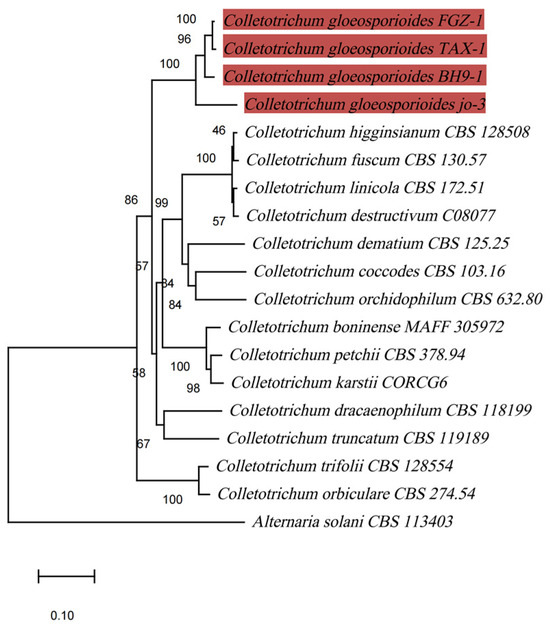 Phylogenetic maximum-likelihood tree, computed from the concatenated sequences of ITS, ACT, and GAPDH of 19 fungal strains using MEGA software (version X). Alternaria solani CBS 113403 was chosen as an outgroup. Bootstrap support values higher than 50% are shown above the branches. The scale bar indicates the number of nucleotide substitutions per site. The branches highlighted in red represent C. gloeosporioides sequences.