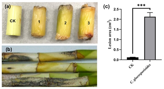 The symptoms of Colletotrichum gloeosporioides FGZ-1 inoculated on lucky bamboo segments (a) and live plants (b). CK, inoculated with pure PDA plugs as controls; 1–3, inoculated with C. gloeosporioides FGZ-1 mycelial plugs. The surface lesion area was measured and calculated using ImageJ 2.0 (c). The data are expressed as the mean ± SD from three biological replicates (one-way ANOVA, Tukey’s Multiple Comparison Test; *** p < 0.001).