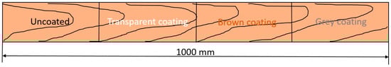 From each TM regime, one board was selected whose mass loss was closest to the average mass loss for the entire modification regime (18 boards for each treatment for aspen and birch, 20 boards for pine). A raw board for each species was selected according to the same principle. Each selected board was sawn into 4 equal parts with dimensions of 240 × 100 × 22 mm (longitudinal × tangential × radial). Prior to coating, specimens were conditioned in a normal climate (20 ± 2 °C, 65 ± 5% relative humidity). For all specimens, the side edges were coated with urethane alkyd lacquer (brushed on application, three coats). One sample remained without coating, while the others were coated with a transparent, brown, or grey wood surface protection agent according to the principle in Figure 1. Three commercial products of Protim Wood oil (Koppers, Helsingborg, Sweden) based on linseed oil were used: 1. without pigment; 2. with brown pigment; 3. with grey pigment. All products contained phthalic anhydride, maleic anhydride, 3-Iodo-2-propynylbuthyl carbamate, and 2-octyl-2H-isothiazol-3one. Oil products were applied to the samples’ surfaces with a brush and air-dried until the surface was no longer shiny. Similarly, the samples’ surfaces were coated twice more. All linseed oil-based wood protection solutions were stirred properly before use.