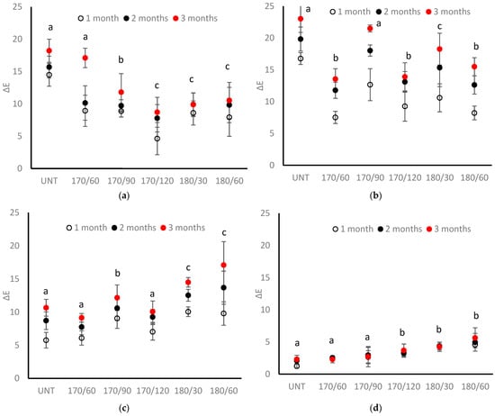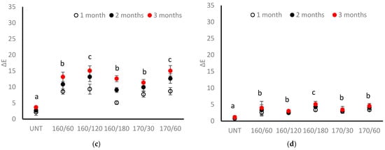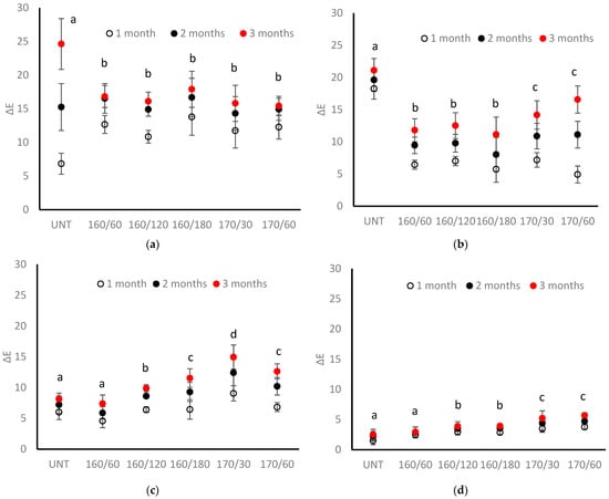 Colour difference parameter ΔE of untreated (UNT) and TM birch wood after exposure to outdoor conditions for 1, 2, and 3 months: (a) uncoated specimens; (b) specimens coated with transparent coating; (c) specimens coated with brown coating; (d) specimens coated with grey coating. (Letters a–d show the statistical difference between TM regimes after 3 months.)