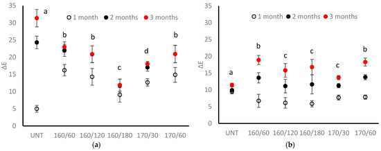 Figure 4 displays the colour difference parameter ΔE of TM and untreated pine wood with and without coatings following 1 to 3 months of weathering in real outdoor conditions. In comparison to TM wood (4–9 units), untreated pine already had a very high ΔE (14 units) after 1 month. For untreated wood, ΔE grew somewhat (16 units) after 2 months and reached 18 units after 3 months (Figure 4a). Uncoated pine wood had colour changes as a result of blue stain growth that occurred gradually over several months. After 2 months, there was no discernible increase in ΔE for TM wood. Only TM samples in the regime P170/60 showed similar ΔE after 3 months compared to untreated wood. ΔE dropped with increasing time at Tmax for samples modified at 170 °C. The test revealed that the most intense treatments (P170/120, P180/30, and P180/60) had the lowest ΔE overall.