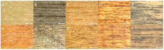 Microscopy pictures of untreated and TM European aspen wood before and after exposure to outdoor conditions for 3 months, scale bar 500 µm: (A) untreated wood without coating before test; (B) untreated wood without coating after test; (C) untreated wood with transparent coating after test; (D) untreated wood with brown coating after test; (E) untreated wood with grey coating after test; (F) TM wood without coating before test; (G) TM wood without coating after test; (H) TM wood with transparent coating after test; (I) TM wood with brown coating after test; (J) TM wood with grey coating after test.