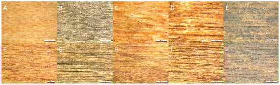 Microscopy pictures of untreated and TM Scots pine wood before and after exposure to outdoor conditions for 3 months, scale bar 500 µm: (A) untreated wood without coating before test; (B) untreated wood without coating after test; (C) untreated wood with transparent coating after test; (D) untreated wood with brown coating after test; (E) untreated wood with grey coating after test; (F) TM wood without coating before test; (G) TM wood without coating after test; (H) TM wood with transparent coating after test; (I) TM wood with brown coating after test; (J) TM wood with grey coating after test.