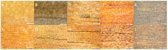 Microscopy pictures of untreated and TM silver birch wood before and after exposure to outdoor conditions for 3 months, scale bar 500 µm: (A) untreated wood without coating before test; (B) untreated wood without coating after test; (C) untreated wood with transparent coating after test; (D) untreated wood with brown coating after test; (E) untreated wood with grey coating after test; (F) TM wood without coating before test; (G) TM wood without coating after test; (H) TM wood with transparent coating after test; (I) TM wood with brown coating after test; (J) TM wood with grey coating after test.