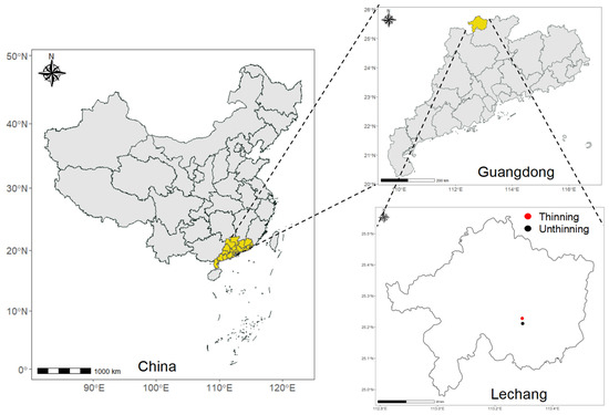 In July 2022, we identified control (unthinned) and thinning sites with similar topography and soil characteristics (Figure 1). Three plots measuring 600 m2 (20 m × 30 m) were established at each site, resulting in six plots (2 treatments × 3 replicates). To reduce spatial autocorrelation, replicates were spaced 1000 m apart, and plots were located at least 20 m from roads and other forested areas. We identified and characterized shrub and herb species with heights under 1.3 m [33,34]. Various species diversity indices were assessed, including species richness, Simpson’s dominance index, Shannon–Wiener diversity index, and Pielou dominance index [33,34]. The diameter at breast height (DBH) in centimeters and tree height (TH) in meters were measured for all trees present, and the basal area (BA) in m2 per hectare was calculated within the sampling plots. Tree biomass was estimated using the methodology outlined by Li et al. [33,34] (Table S1).