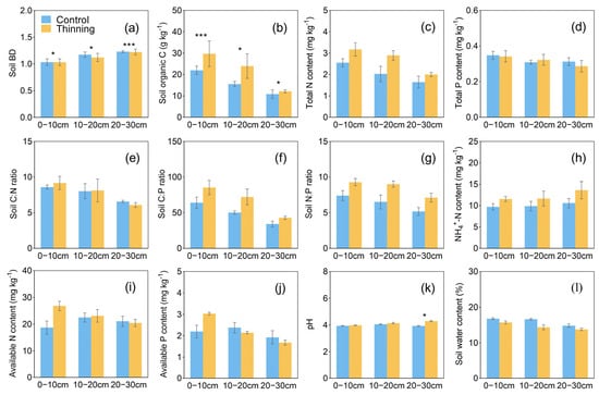 Effects of control and thinning treatments on soil BD (a, bulk density), soil organic carbon (b), total N (c), total P (d), C:N ratio (e), C:P ratio (f), N:P ratio (g), NH4+-N (h), available N (i), available P (j), pH (k), and soil water content (l) in Castanopsis hystrix plantation forests. Values are mean ± standard error (n = 3). * and *** indicate the significance level between control and thinning treatments at p < 0.05 and p < 0.001, respectively.