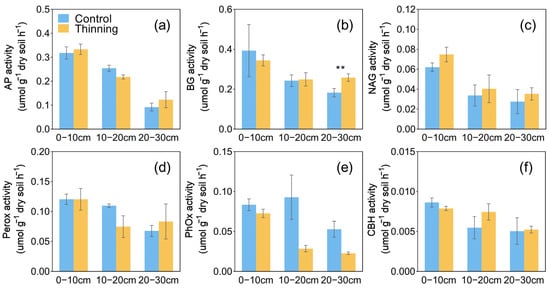 Effects of control and thinning treatments on AP activity (a, acid phosphomonoesterase), BG activity (b, β-glucosidase), NAG activity (c, N-acetylglucosaminidase), Perox activity (d, peroxidase), PhOx activity (e, phenol oxidase), and CBH activity (f, cellobiohydrolase) in Castanopsis hystrix plantation forests. Values are mean ± standard error (n = 3). ** indicate the significance level between control and thinning treatments at p < 0.01.