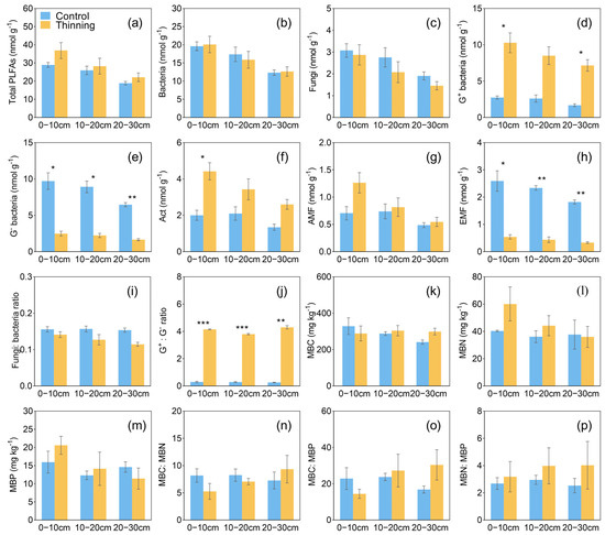 Effects of control and thinning treatments on total PLFAs (a), bacteria (b), fungi (c), G+ bacteria (d), G− bacteria (e), Act (f), AMF (g), EMF (h), fungi/bacteria ratio (i), G+:G− ratio (j), MBC (k), MBN (l), MBP (m), MBC:MBN ratio (n), MBC:MBP ratio (o), and MBN:MBP ratio (p) in Castanopsis hystrix plantation forests. Values are mean ± standard error (n = 3). *, **, and *** indicate the significance level between control and thinning treatments at p < 0.05, p < 0.01, and p < 0.001, respectively.