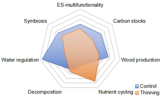 The subordinate function values of ES-multifunctionality (ecosystem multifunctionality), including symbiosis, carbon stocks, wood production, nutrient cycling, decomposition, and water regulation functions, in Castanopsis hystrix plantation forests under the control and thinning treatments.