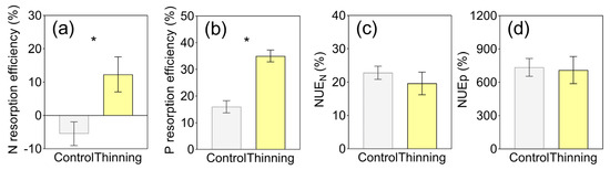 Effects of control and thinning treatments on N (nitrogen) resorption efficiency (a), P (phosphorus) resorption efficiency (b), NUEN (c), and NUEp (d) in Castanopsis hystrix plantation forests. Values are mean ± standard error (n = 3). * indicate the significance level between control and thinning treatments at p < 0.05.