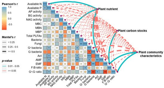 Correlation analysis of soil properties (available N and available P), soil enzyme activities (AP, BG, and NAG activities), microbial community (total PLFAs, bacteria, G+ bacteria, G− bacteria, fungi, Act, AMF, EMF, F:B ratio, and G+:G− ratio) with plant nutrient contents, plant carbon stocks, and plant community characteristics in Castanopsis hystrix plantation forests under the control and thinning treatments. *, **, and *** indicate that the significance level is at p < 0.05, p < 0.01, and p < 0.001, respectively. Total PLFAs, total phospholipid fatty acids; Act, actinomycete; AMF, arbuscular mycorrhizal fungi; EMF, ectomycorrhizal fungi; F:B ratio, fungi/bacteria ratio; G+:G− ratio, G+ bacteria/G− bacteria ratio.