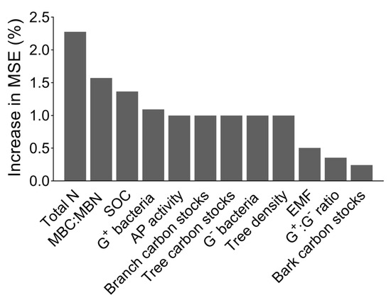 The random forest model predicts the key soil factors affecting the ecosystem multifunctionality under the control and thinning treatments. A higher percentage of increase in mean square error (MSE) values implies more important predictors. SOC, soil organic carbon; EMF, ectomycorrhizal fungi; AP activity, acid phosphomonoesterase.