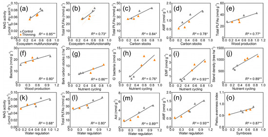 Linear regression analysis of ecosystem multifunctionality (symbiosis, carbon stocks, wood production, nutrient cycling, decomposition, and water regulation) with soil and plant properties ((a) correlation between NAG activity and ecosystem multifunctionality; (b) correlation between total PLFAs and ecosystem multifunctionality; (c) correlation between total PLFAs and carbon stocks; (d) correlation between AMF and carbon stocks; (e) correlation between total PLFAs and wood production; (f) correlation between bacteria and wood production; (g) correlation between bark carbon stocks and nutrient cycling; (h) correlation between G− bacteria and nutrient cycling; (i) correlation between EMF and nutrient cycling; (j) correlation between stand density and nutrient cycling; (k) correlation between NAG activity and water regulation; (l) correlation between total PLFAs and water regulation; (m) correlation between Act and water regulation; (n) correlation between AMF and water regulation; (o) correlation between Pielou evenness and symbiosis) in Castanopsis hystrix plantation forests under the control and thinning treatments. * and ** indicate that the significance level is at p < 0.05 and p < 0.01, respectively.