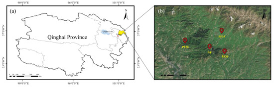 This study was conducted in Huzhu Tu Autonomous County, Qinghai Province (36°30′–37°9′ N and 101°46′–102°45′ E; Figure 1a), at an altitude range of 2100–3500 m. This region has an alpine continental mountain climate with monsoonal characteristics. The average annual temperature is 5 °C, annual precipitation is 500 mm, and average annual evaporation is 1260 mm [39]. The original forests of the region were destroyed by prolonged anthropogenic disturbances, with the current vegetation primarily consisting of naturally regenerated forests, including P. crassifolia, Juniperus przewalskii, Populus cathayana, and Betula albosinensis, and planted forests, including P. crassifolia, Pinus tabuliformis, and Larix gmelinii. The soil mainly has loess-like sediment parent materials. According to the Chinese Soil Taxonomy, the primary soil type is Typic Hapli–Ustic Iso Humisol.