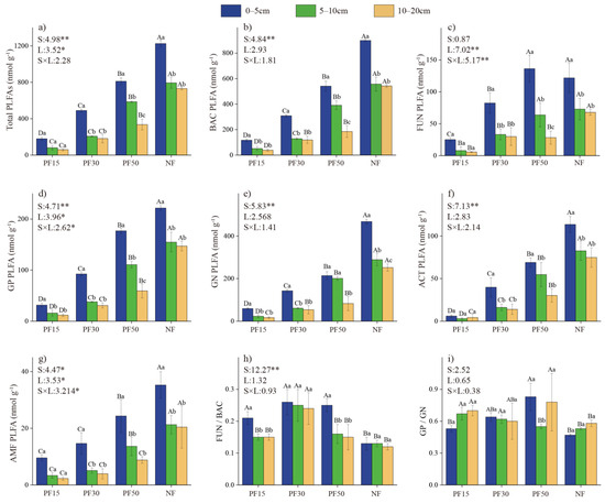 Microbial phospholipid fatty acid (PLFA) abundances and community structure under four stand types: (a) total PLFAs, total concentration of PLFAs; (b) BAC PLFA, bacterial PLFA; (c) FUN PLFA, fungal PLFA; (d) GP PLFA, gram-positive PLFA; (e) GN PLFA, gram-positive PLFA; (f) ACT PLFA, actinomycetal PLFA; (g) AMF PLFA, arbuscular mycorrhizal fungal PLFA; (h) FUN/BAC, the ratio of fungal PLFA to bacterial PLFA, and (i) GP/GN, the ratio of gram-positive PLFA to gram-negative PLFA. Error bars indicate the standard error of the mean (n = 3). Distinct superscript upper- and lowercase letters indicate significant differences among stand types at the same soil depth, as well as among three soil depths for the same stand type, respectively. PF15, PF30, PF50 and NF stand for 15-, 30-, 50-year-old P. crassifolia plantation forests and natural forest, respectively. S, L, and S × L indicate the F-values for the effects of stand type (S), soil depth (L), and their interaction (S × L) based on two-way ANOVA. ** p < 0.01; * p < 0.05.