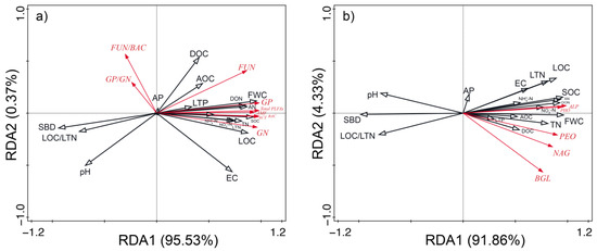 RDA of (a) soil microbial communities and abiotic factors, with black arrows representing abiotic factors and red arrows representing microbial communities, and (b) soil enzyme activities and abiotic factors, with black arrows indicating abiotic factors and red arrows indicating enzyme activities. Abbreviations are as defined in Table 1 and Table 2 and Figure 2.