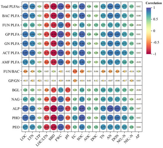 Based on Pearson’s correlation coefficients, different microbial communities and enzyme activity levels were sensitive to changes in various abiotic factors (Figure 4). LOC, LTN, SBD, FWC, SOC, AOC, TN, AN, DON, NO3−-N, and NH4+-N were significantly related to PLFA abundance and enzyme activity levels.