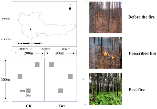 Schematic diagram of the burn plot before the fire, during the prescribed burning, and after the fire.