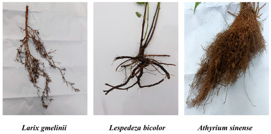 For each sampling, eight cores were randomly collected from each plot, and 24 fine root biomass samples were collected from different soil layers within the burned and control plots of each treatment (nine of the fine root sampling points also included the collection of adjacent soil) and were mechanically separated into layers of 0–10 cm and 10–20 cm (the sampling depth of 0–20 cm represents the total fine root biomass [36]). The soil cores were placed in sealed bags, preserved at −4 °C by ice packs, and transported to a laboratory. The two fine root categories were further separated into live and dead fine roots using visual observation (color) and elasticity, as determined by Persson [37]. We adopted the conventional method for fine roots (<2 mm) and referred to the classification methods for different life-form roots by Hu et al. [38] (trees, shrubs, and herbs) and for different functional root groups in larch by Salahuddin et al. [39] (AFRB primarily consists of the first to third root orders, and TFRB primarily consists of over-the-third root orders but with a diameter of less than 2 mm). During the peak growing season, all vegetation above- and belowground within the burned and control plots was excavated using a shovel. Centered around the plant, a 50 cm × 50 cm area was dug to a depth of 20 cm. Soil and impurities were removed to obtain fine root samples of the plant. Trees, shrubs, and herbs were identified according to plant nomenclature, and the fine roots in the soil cores were classified into different root groups based on their function (Figure 2, Supplementary Table S1). Fine root samples were dried at 100 °C for 48 h, weighed, ground in a mill grinder, and passed through a 60-mesh sieve, and their total carbon content was determined using a carbon and nitrogen analyzer (Multi C/N 3000; Analytik Jena, Germany). Please refer to Supplementary Table S2 for a designation of the fine roots.