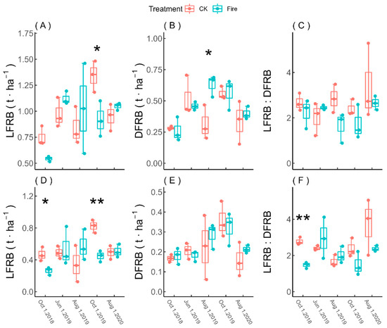 Changes in LFRB and DFRB after prescribed burning. Data are presented as means (standard deviations); N = 3. Statistical method: one-way analysis of variance. Significance: * p < 0.05, ** p < 0.01. (A–C) represent the 0–10 cm soil layer, (D–F) represent the 10–20 cm soil layer, (A,D) represent the living fine root biomass, (B,E) represent the dead fine root biomass, and (C,F) represent the ratio of living to dead fine root biomass.