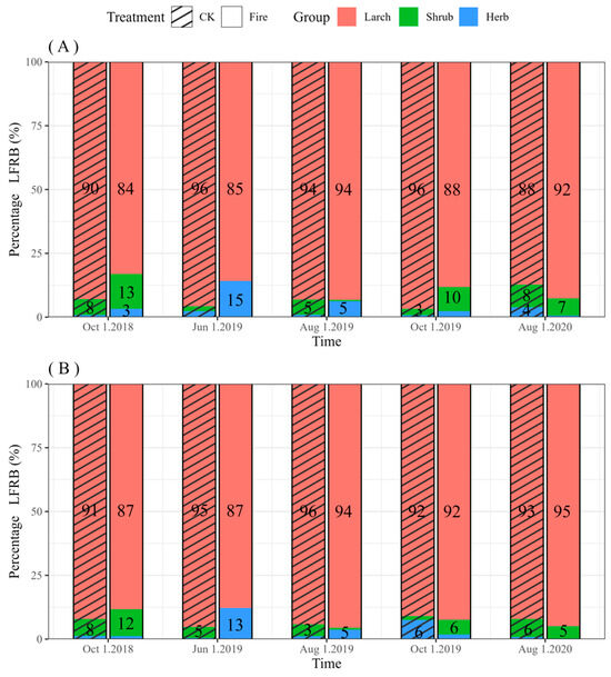 Changes in the proportion of different life forms’ FRB in LFRB after prescribed burning. Note: (A) represents the percentage of LFRB in the 0–10 cm soil layer, and (B) represents the percentage of LFRB in the 10–20 cm soil layer. N = 3.