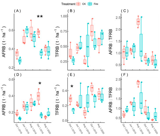 Changes in AFRB and TFRB following prescribed burning. Note: Data are presented as means (standard deviations); N = 3. Statistical method: one-way analysis. Significance: * p < 0.05, ** p < 0.01. (A–C) refer to the 0–10 cm soil layer, (D–F) refer to the 10–20 cm soil layer, (A,D) represent the biomass of absorptive roots, (B,E) represent the biomass of transport roots, and (C,F) represent the ratio of absorptive roots to transport roots.