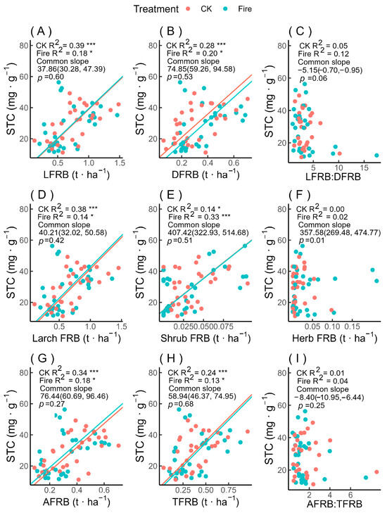 Linear fit of FRB and its ratios with STC after prescribed burning. Note: Data represent means (standard deviations); N = 3 plots × 5 samplings × 2 layers = 30. (A) represents the linear fit between live fine root biomass and soil total carbon; (B) represents the linear fit between dead fine root biomass and soil total carbon; (C) represents the linear fit between the ratio of live to dead fine root biomass and soil total carbon; (D) represents the linear fit between larch fine root biomass and soil total carbon; (E) represents the linear fit between shrub fine root biomass and soil total carbon; (F) presents the linear fit between herb fine root biomass and soil total carbon; (G) represents the linear fit between absorptive fine root biomass and soil total carbon; (H) represents the linear fit between transport fine root biomass and soil total carbon; (I) represents the linear fit between the ratio of absorptive to transport fine root biomass and soil total carbon. Significance levels: * for p < 0.05, and *** for p < 0.01.