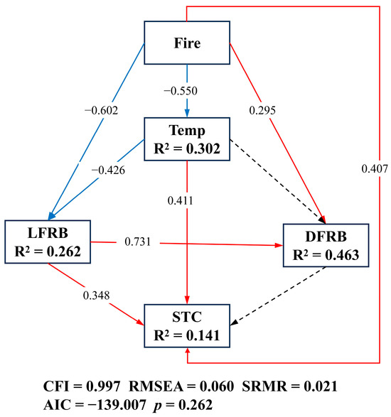 Structural equation model (SEM) displaying the effects of fire disturbance, soil temperature, live fine root biomass and dead fine root biomass, and total soil carbon. Note: Data = sampling points; N = 9 sites × 2 layers × 2 sampling points (end of the two growing seasons) = 36. The coefficients represent the standardized predictive coefficients for each causal pathway. Solid red lines indicate positive effects, solid blue lines indicate negative effects, and dashed lines indicate non-significant pathways (p > 0.05). Numbers on the solid lines represent standardized coefficients. The model-derived p value was obtained from the chi-square distribution. Fire is prescribed fire; Temp is soil temperature; LFRB is live fine root biomass; DFRB is dead fine root biomass; STC is total soil carbon. CFI (Comparative Fit Index) is a measure of the fit of a structural equation model. It can be used to measure the consistency between the model and the original data, and the closer the CFI value is to 1, the better the fit of the model. RMSEA is the Root Mean Square Error Approximation (RMSEA), and an RMSEA less than or equal to 0.05 indicates a very good fit. SRMR is the Standardized Root Mean Square Residual (SRMR), which is a commonly used goodness-of-fit metric for structural equation modeling, and the lower the SRMR is, the better the fit is.