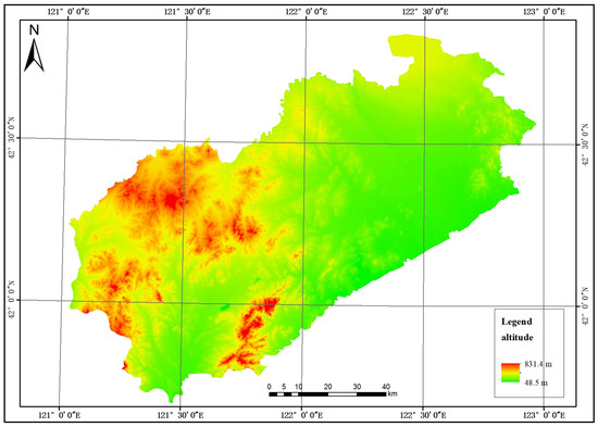 The Fuxin region is located in the northwest of Liaoning Province, China, with an area of 10,355 km2 and a forest cover of about 2901 km2. The northern part of the Fuxin region is the Horqin Sandland, and the eastern part is in the Liaohe Plain. It is a transition zone between the Inner Mongolian steppe and the stony mountainous terrain of North China. The geomorphological pattern of the region is high in the northern part of the west and low in the southern part of the east, as shown in Figure 1. The Fuxin region’s climate is a semi-arid continental monsoon climate characteristic of the north temperate zone; the main feature of the climate is precipitation, but the spatial and temporal distribution is extremely uneven. The rain and heat simultaneously aid the growth of vegetation in the region, providing favorable conditions. The region is characterized by a variety of natural environments and a rich variety of forest species. It is worth noting that the region is at the junction of the semi-humid and semi-arid zones and that the forests of the Fuxin region are also an important part of the windbreak forests in North China, resulting in the distribution of both natural and planted forests, as well as coniferous and broadleaf forests, in the region [35]. Therefore, the classification of forest species in Fuxin is of great significance to the study of carbon storage, the carbon cycle, and desertification control in the region.